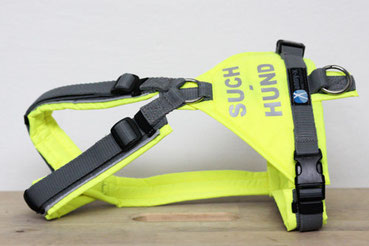 Das gepolsterte (vollunterlegte) Suchhund-Geschirr hat zu der Protectausstattung eine integrierte Kenndecke mit der reflektierenden Transferfolie "Suchhund".