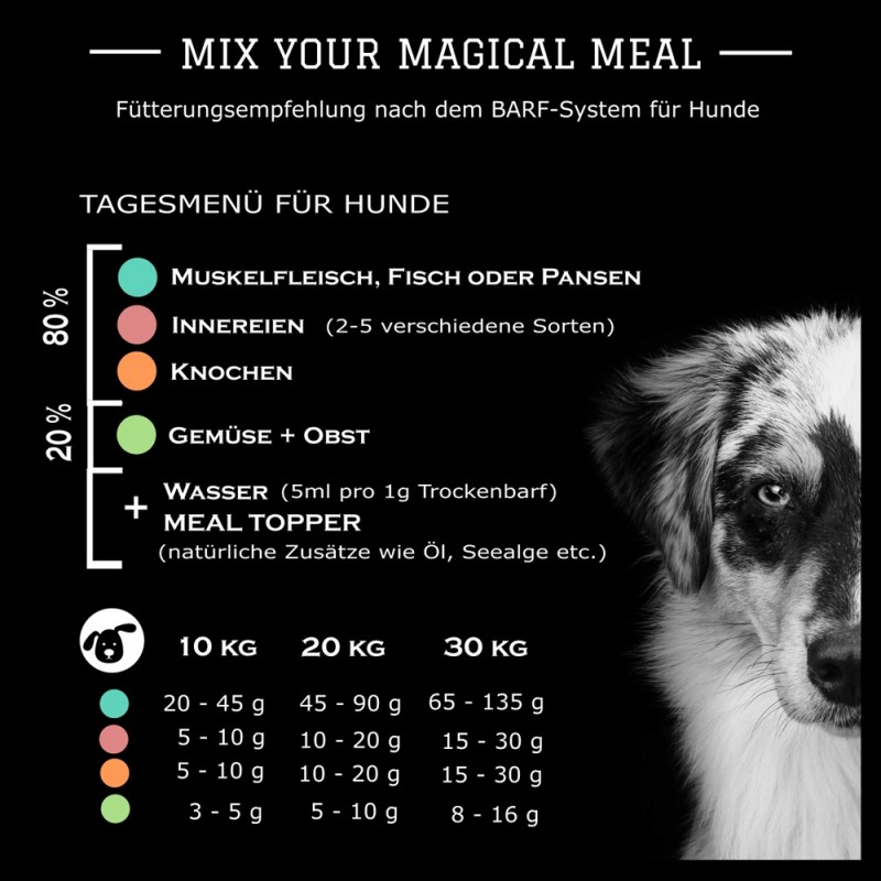 Die fertig portionierten BARF "All in One" eignen sich ideal für ein unkompliziertes Barfen unterwegs. Sie enthalten alle wichtigen Rohstoffe einer ausgewogenen Ernährung. Von proteinreichem Muskelfleisch, über gesunde Innereien bis hin zu den vitaminreichen vegetarischen Komponenten, ist alles im richtigen Verhältnis bereits fertig gemischt.
